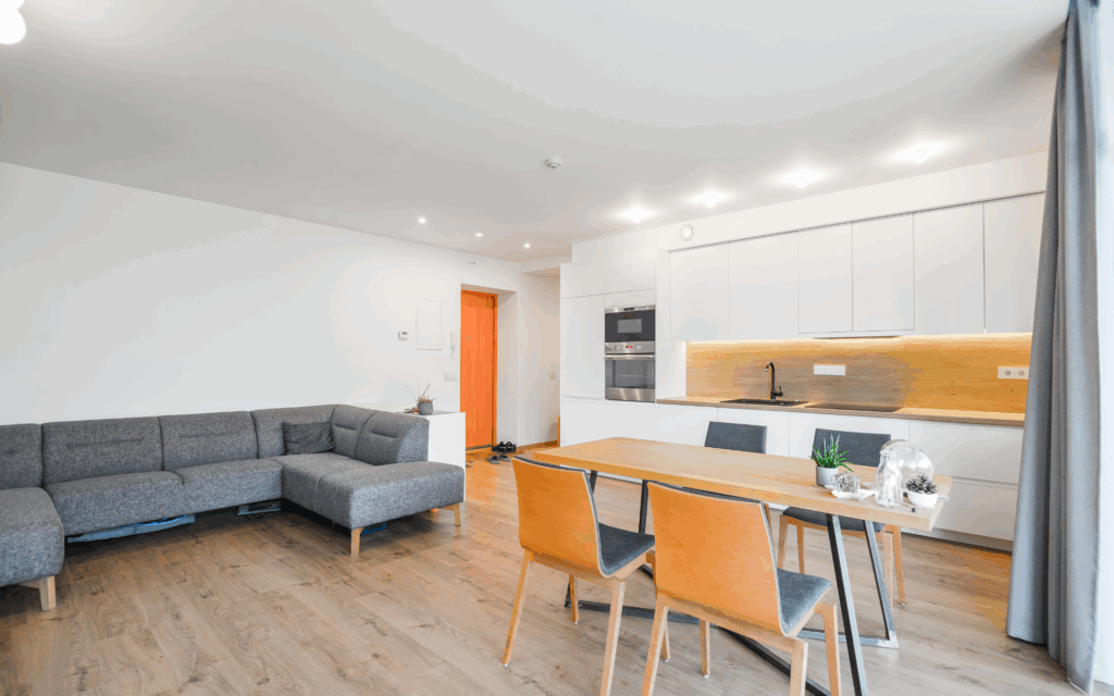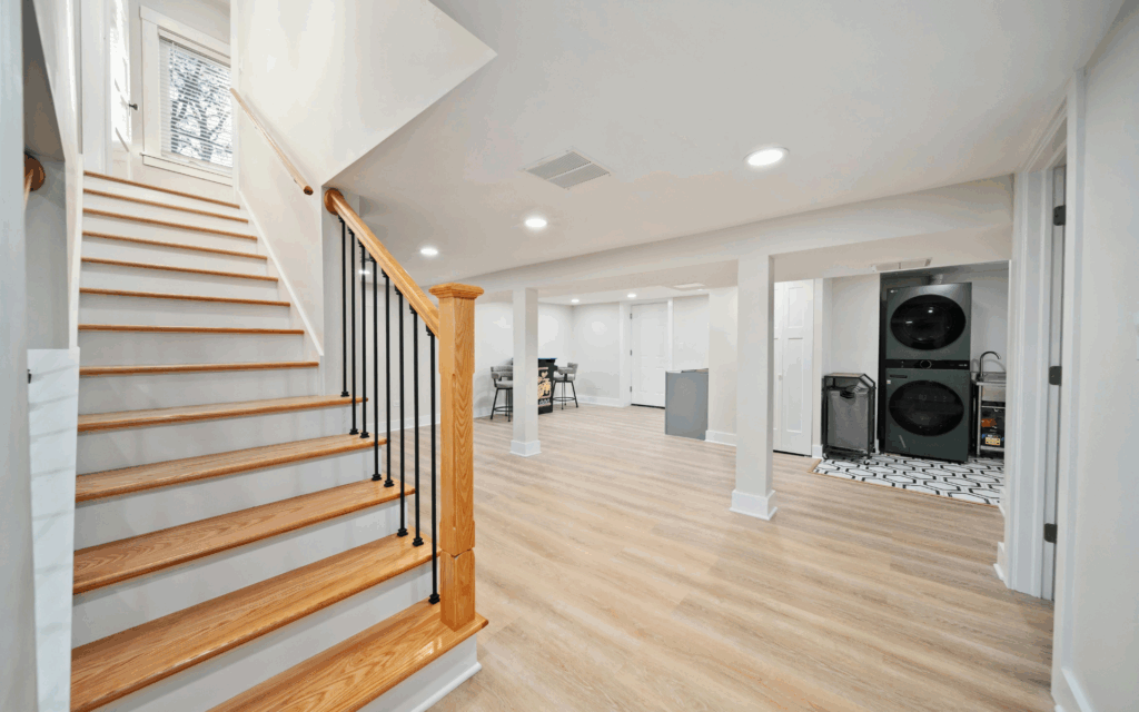Choose durable vinyl plank flooring that can handle both children’s activities and adult gatherings. Add comfortable sectional seating, game tables, and flexible storage solutions. The key is designing a functional space that grows with your family’s lifestyle.