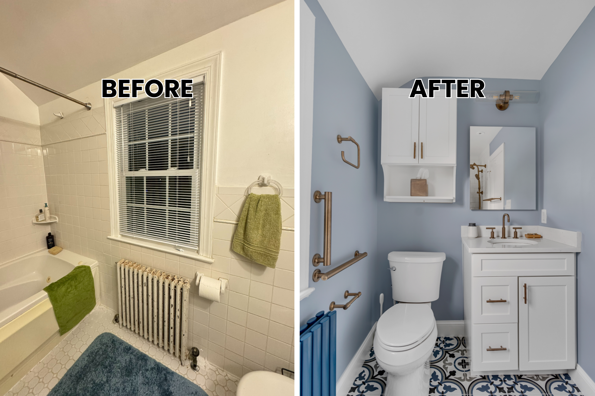 The original bathroom felt cramped and outdated. Basic white subway tile covered the walls without personality. The small wooden vanity provided minimal counter space while old fixtures showed visible wear. Poor lighting made the compact space feel even smaller.