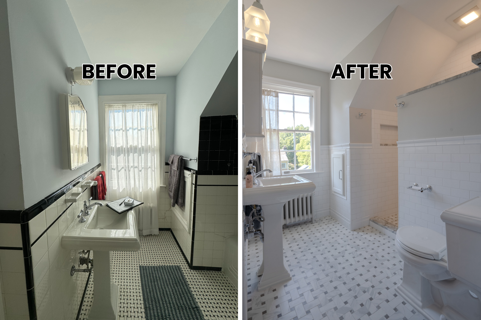 The original bathroom layout wasted valuable space and created daily frustrations for the homeowners in their master bedroom suite. Poor storage solutions meant toiletries and bathroom essentials had no designated home, leading to constant clutter on the limited counter space. The existing materials showed their age with visible wear patterns, stains, and outdated styling that made the entire master bath feel tired and neglected. Inadequate lighting cast unflattering shadows from a basic ceiling fixture, while the overall design lacked cohesion and modern functionality. The cramped feeling persisted despite adequate square footage due to poor space planning and outdated fixture placement. The bathroom needed a complete renovation to match the home’s history and the family’s current lifestyle needs.