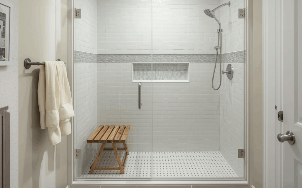 Multiple wall-mounted shower heads plus a rainfall head on top give you that full spa experience. A built-in bench and safety handrails add both convenience and peace of mind.