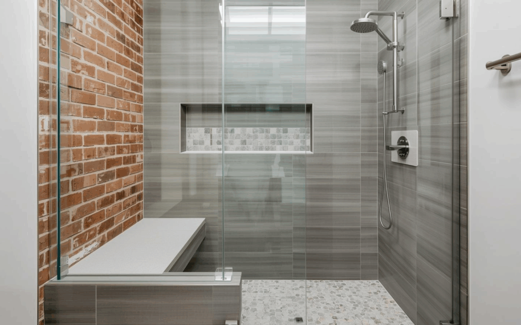 You can create a loft-style, spa-like feel in your shower renovation pretty easily. Start with a brick accent wall, then transition to gray or white shower tiles with sleek glass enclosures on the door and front wall.