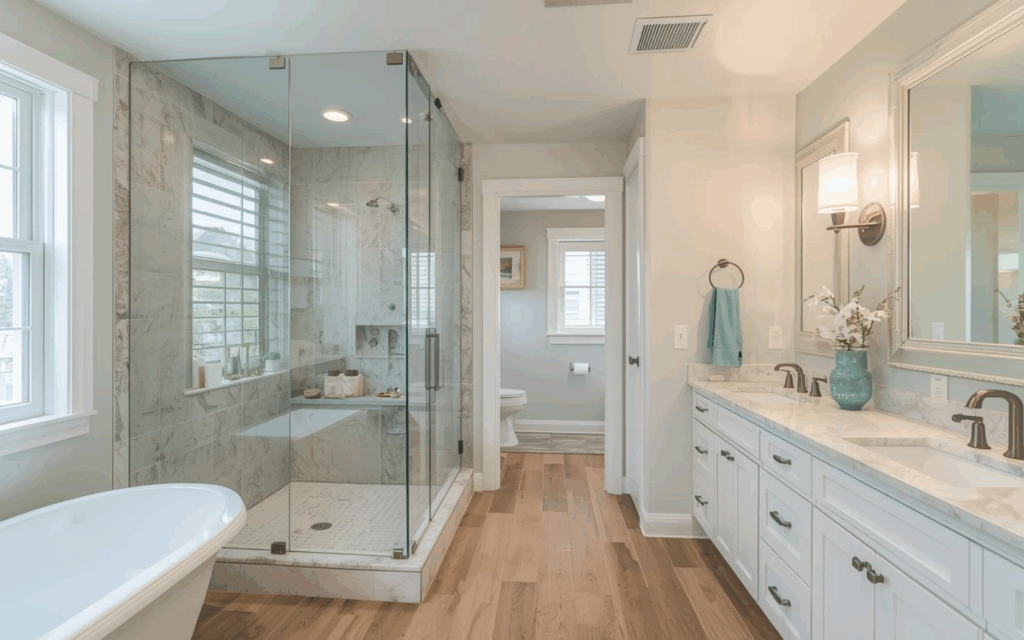 Frameless glass enclosures cost less than framed versions while making any shower space feel larger. They create the impression of a more spacious bathroom, especially when paired with white vanity cabinets for that clean, modern look.