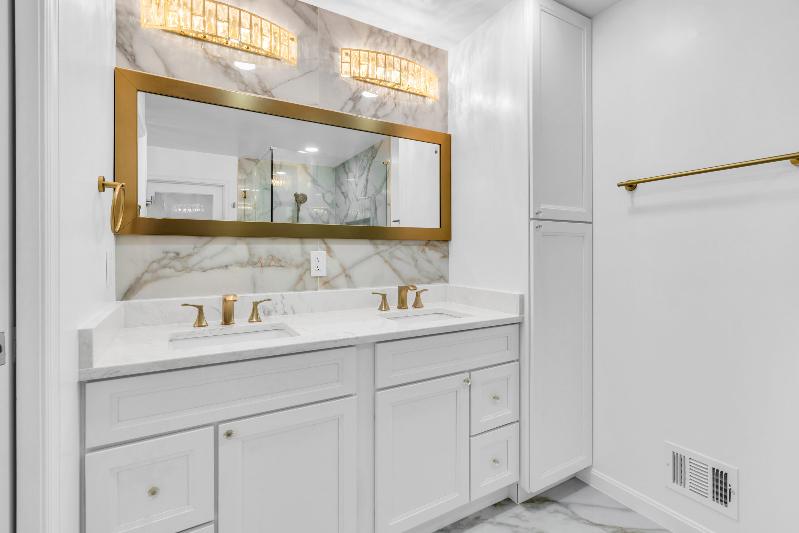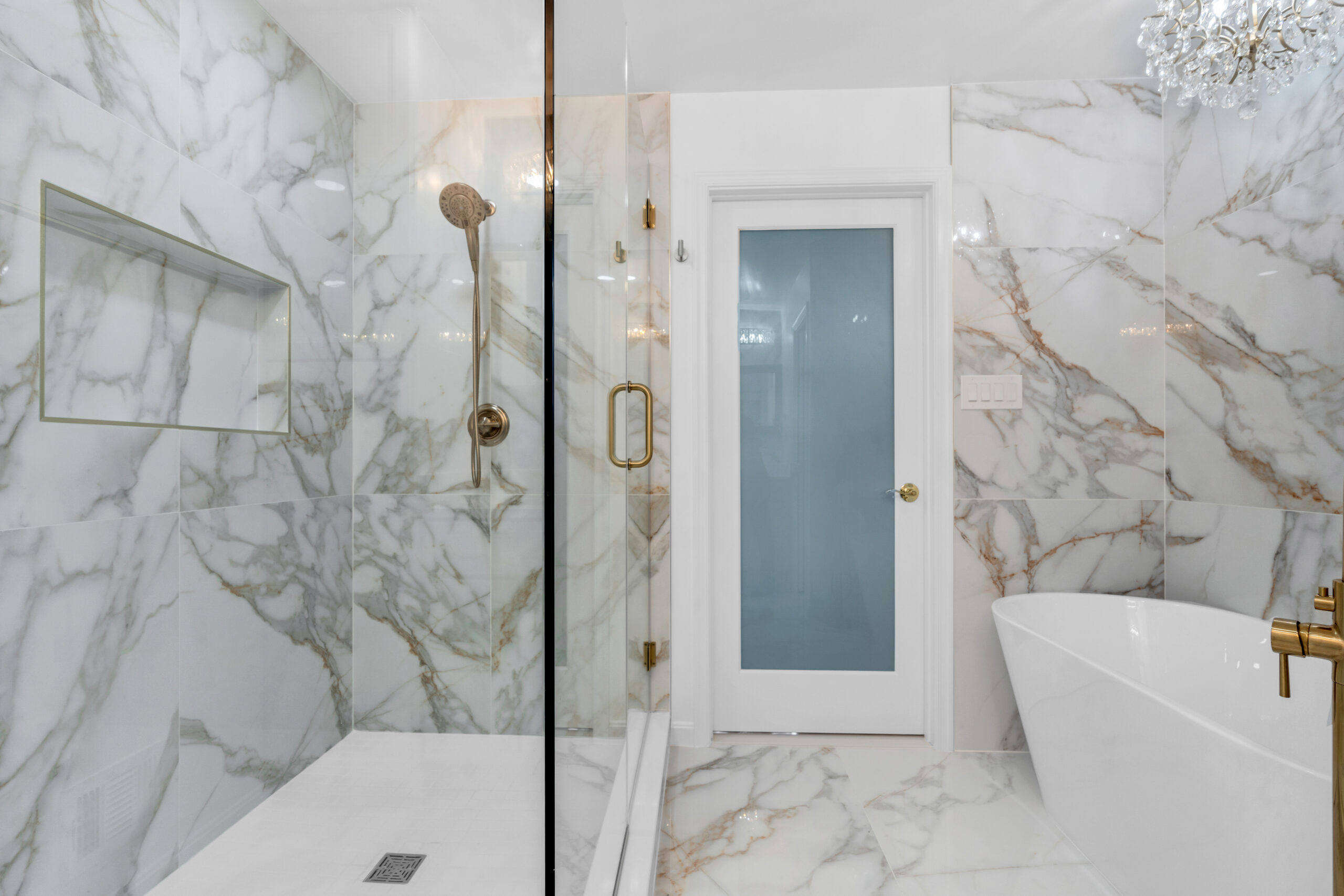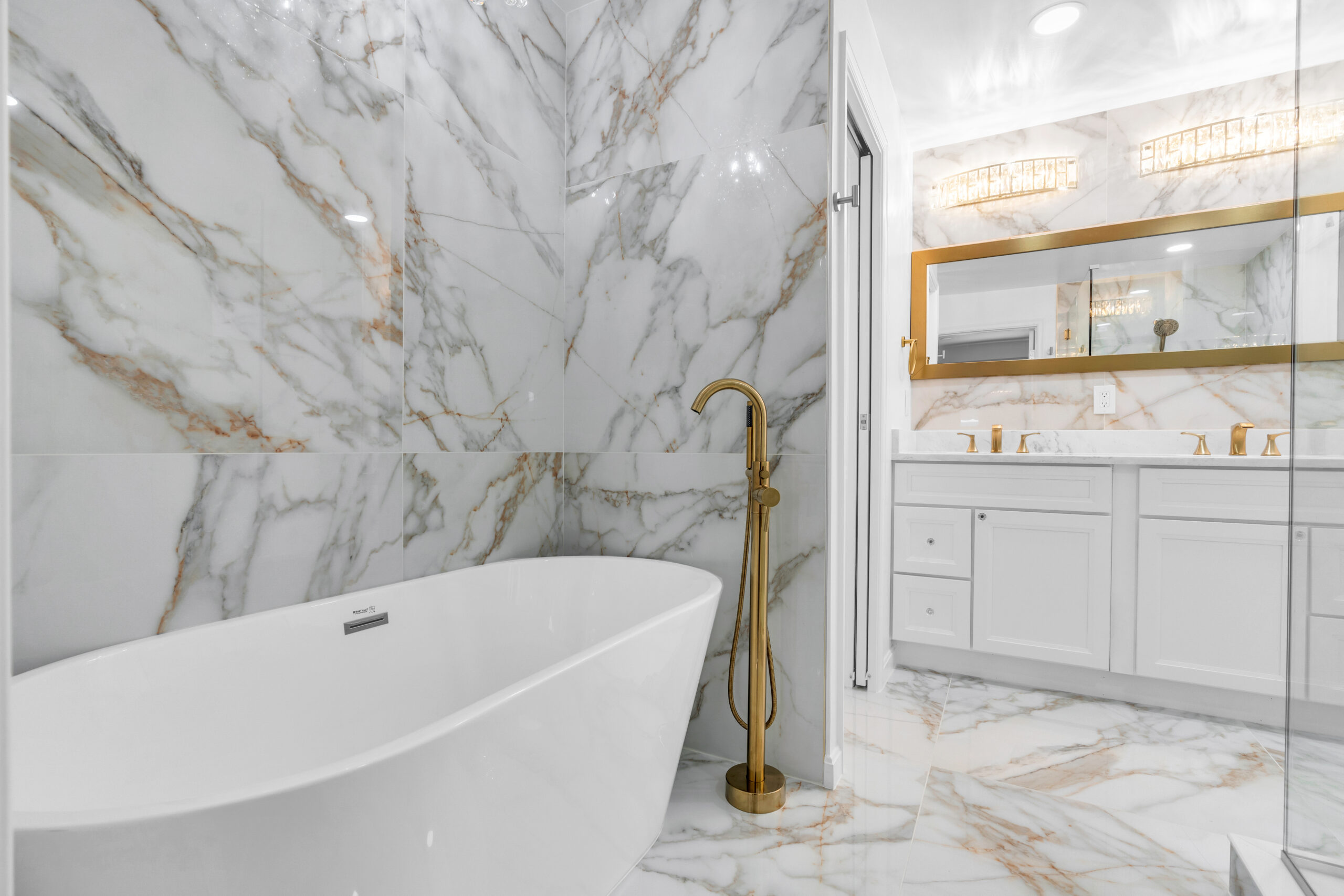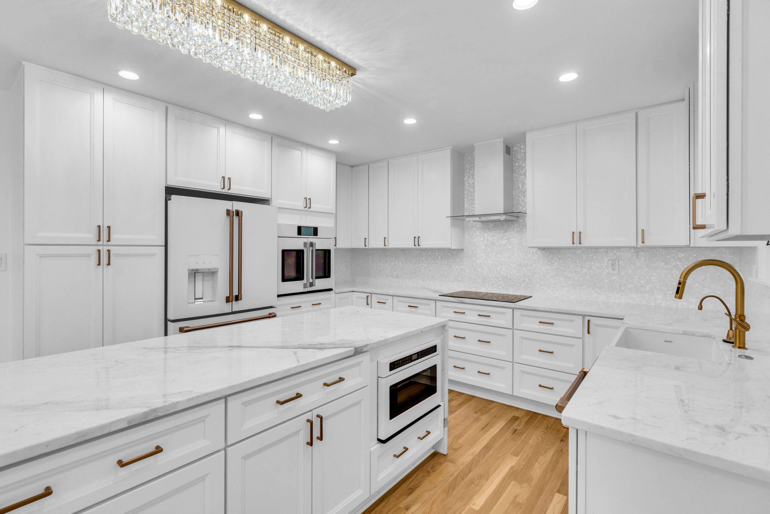 Luxury living took center stage in this stunning Hyattsville home remodeling project featuring kitchen and bathroom renovations. In the kitchen, sleek white shaker cabinets replaced dated oak, paired with elegant gold hardware and expansive white countertops. A crystal chandelier adds unexpected glamour overhead while warm hardwood floors ground the space beautifully. Down the hall, the bathroom mirrors this sophisticated aesthetic with large-format marble, a freestanding soaking tub, and a custom vanity. Gold fixtures and crystal lighting carry the cohesive design throughout. From cooking to relaxing, every space now balances elegant style with everyday function.