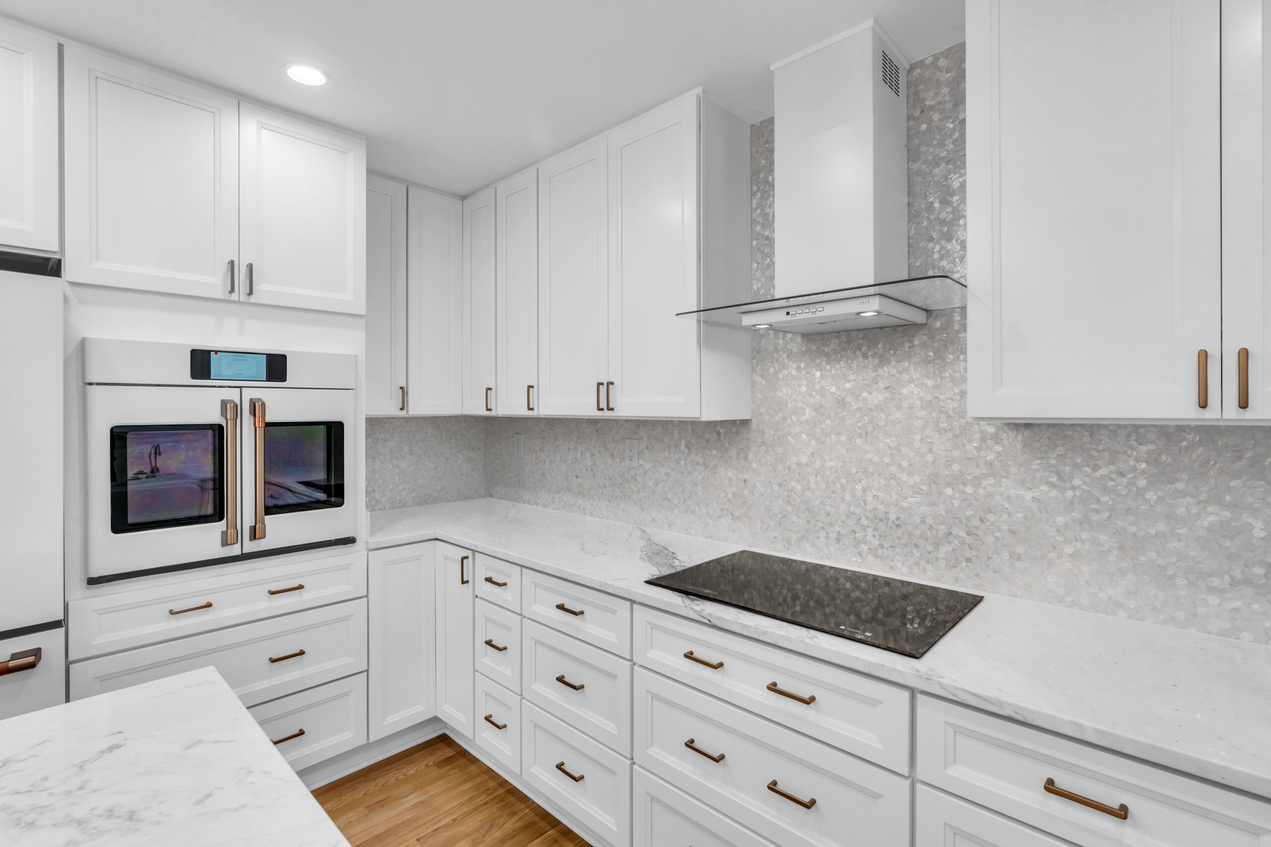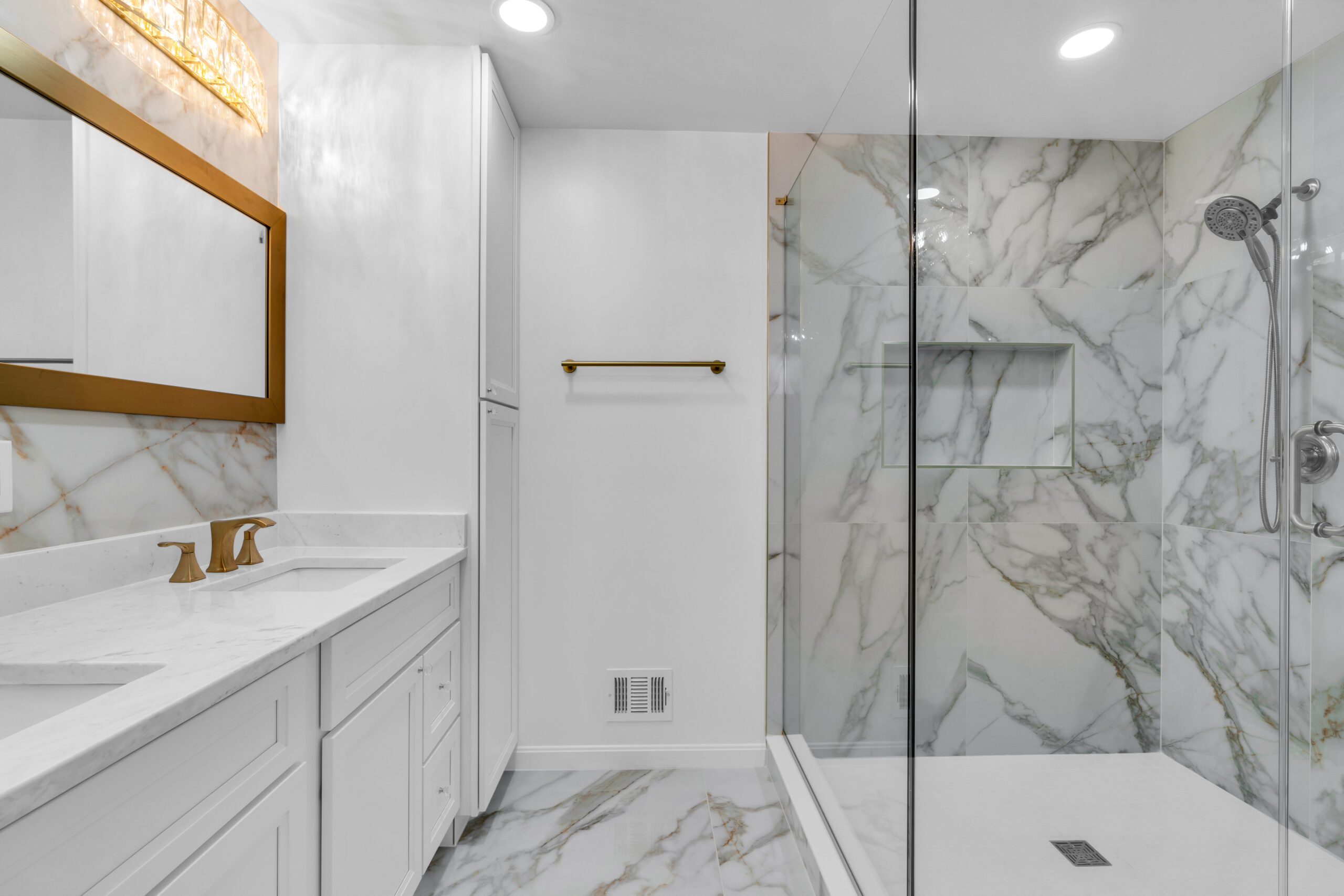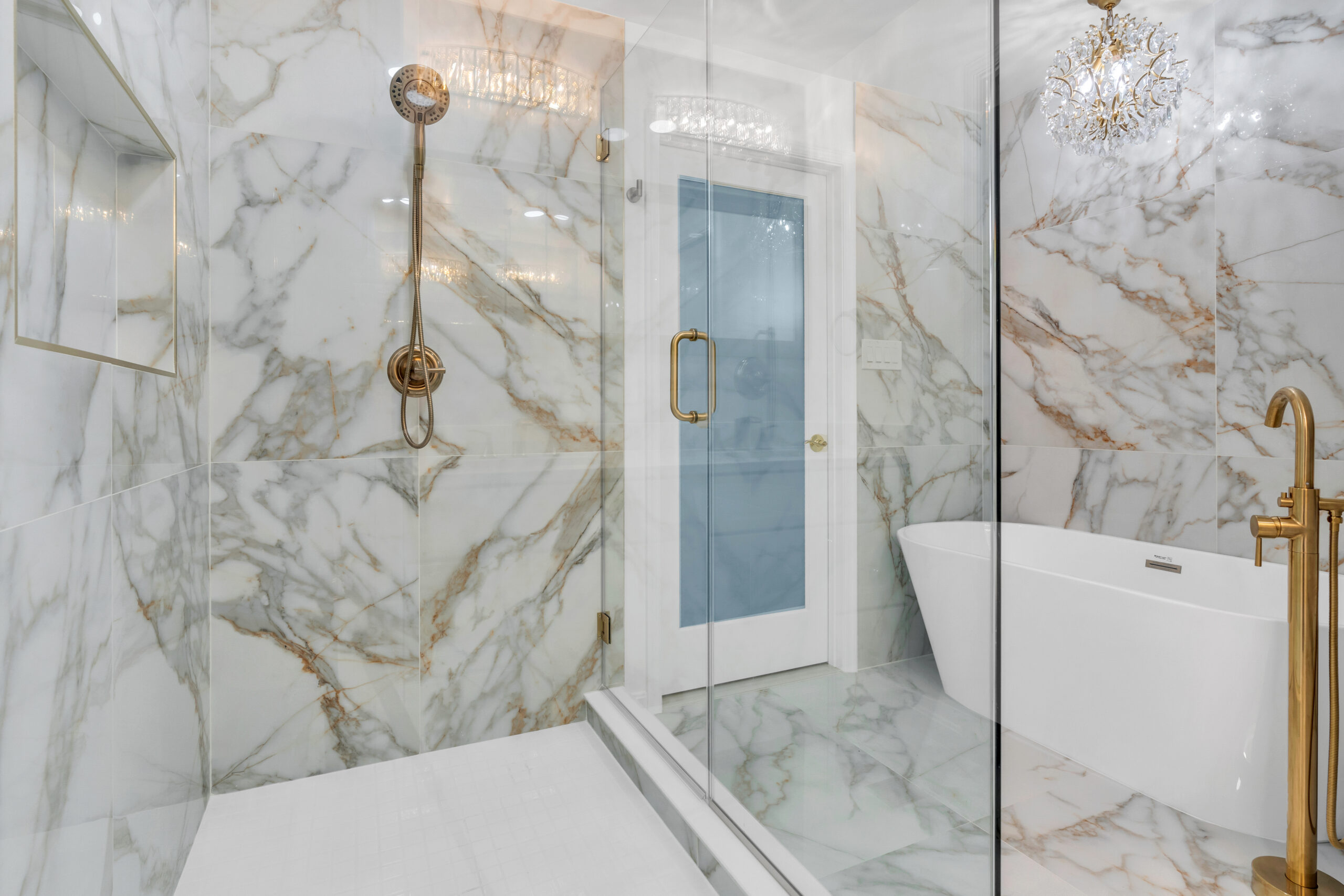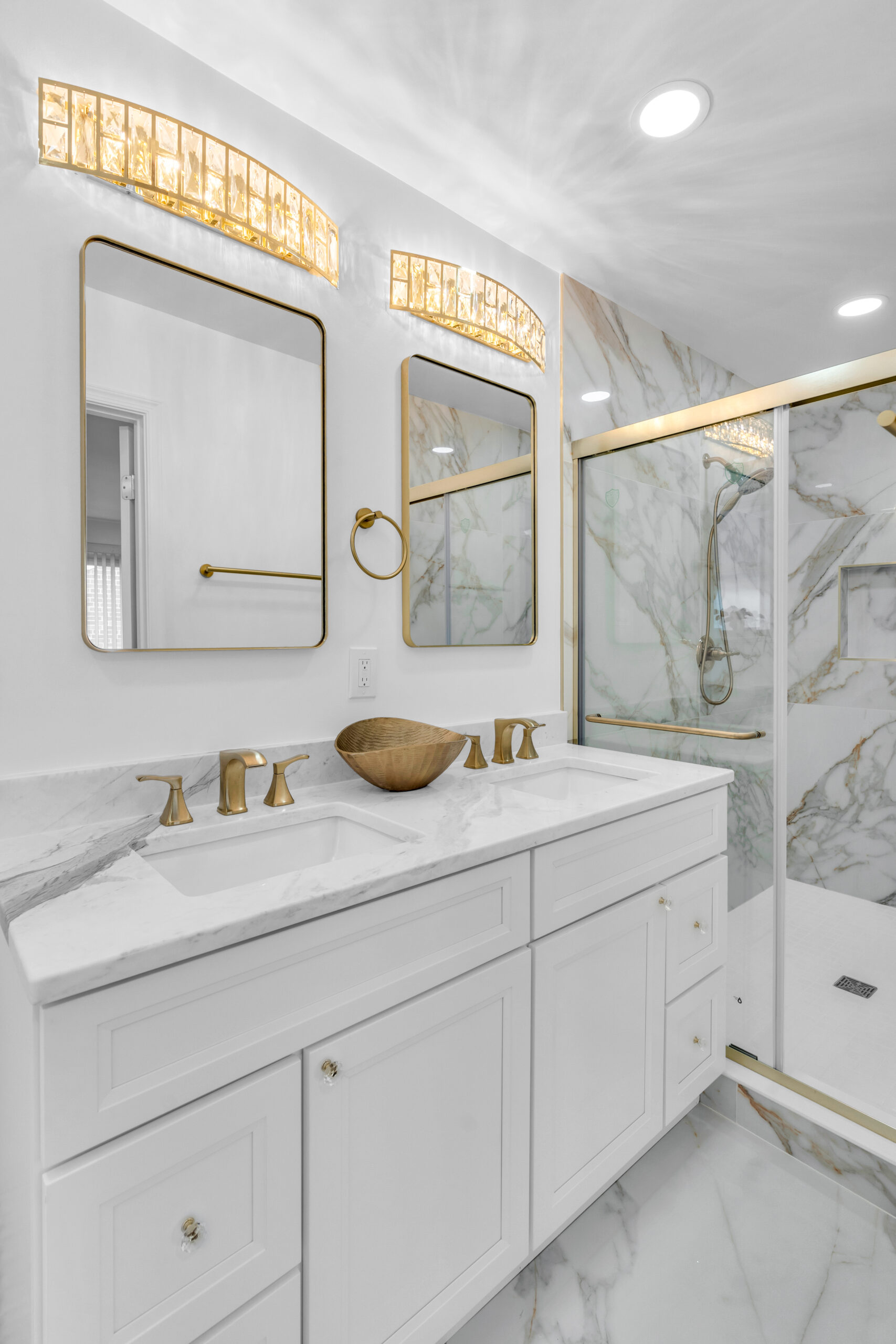 Luxury living took center stage in this stunning Hyattsville home remodeling project featuring kitchen and bathroom renovations. In the kitchen, sleek white shaker cabinets replaced dated oak, paired with elegant gold hardware and expansive white countertops. A crystal chandelier adds unexpected glamour overhead while warm hardwood floors ground the space beautifully. Down the hall, the bathroom mirrors this sophisticated aesthetic with large-format marble, a freestanding soaking tub, and a custom vanity. Gold fixtures and crystal lighting carry the cohesive design throughout. From cooking to relaxing, every space now balances elegant style with everyday function.