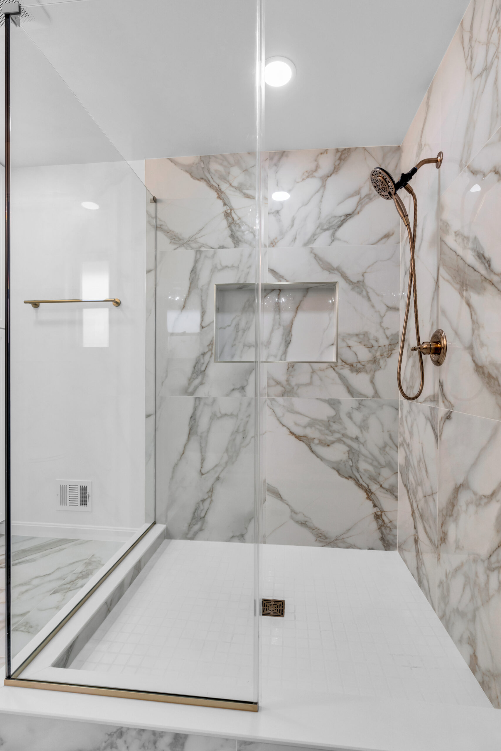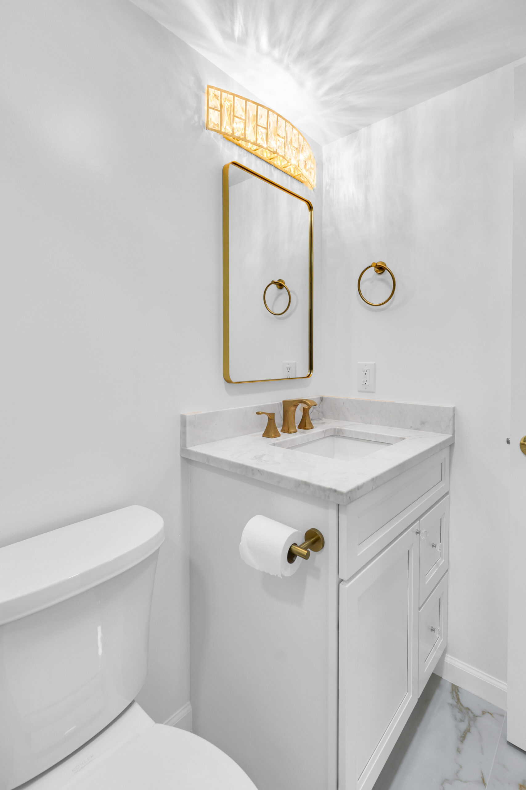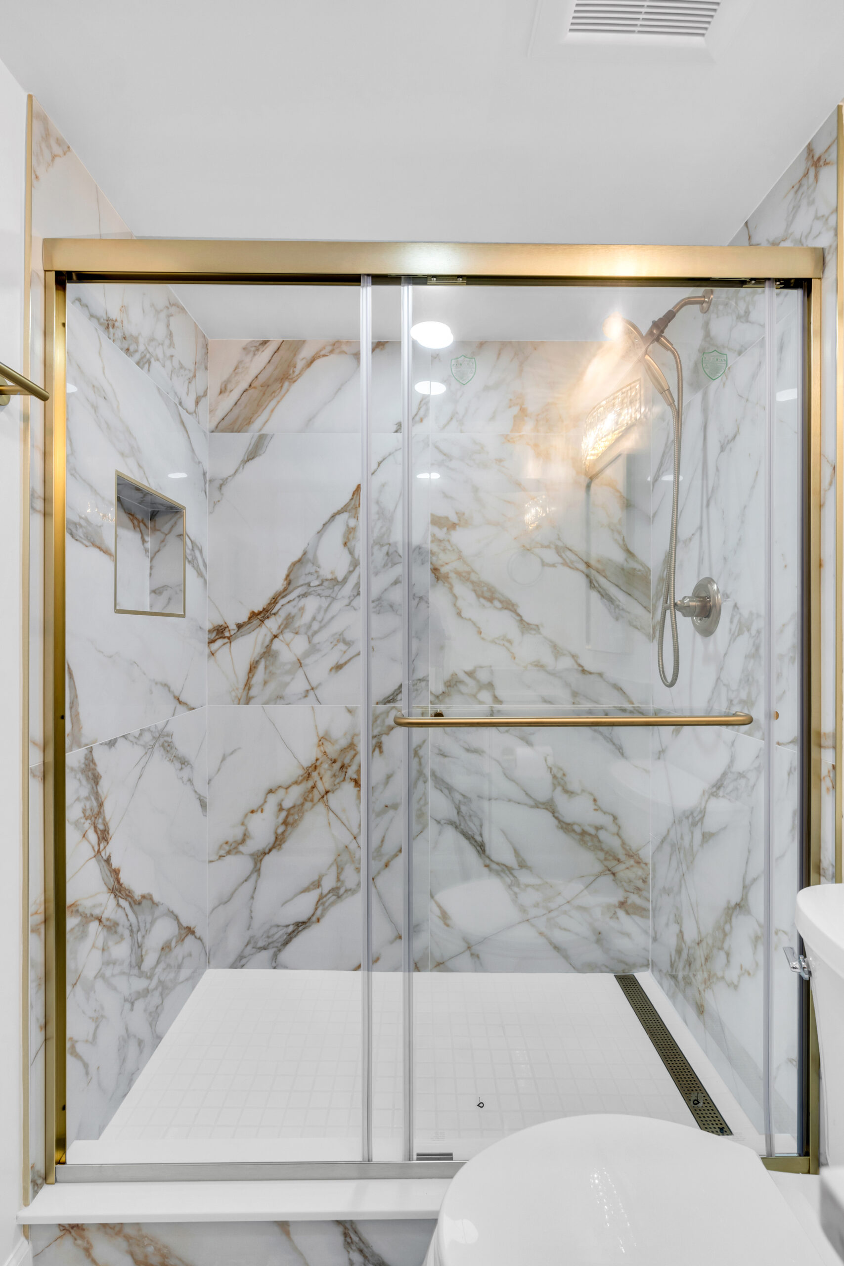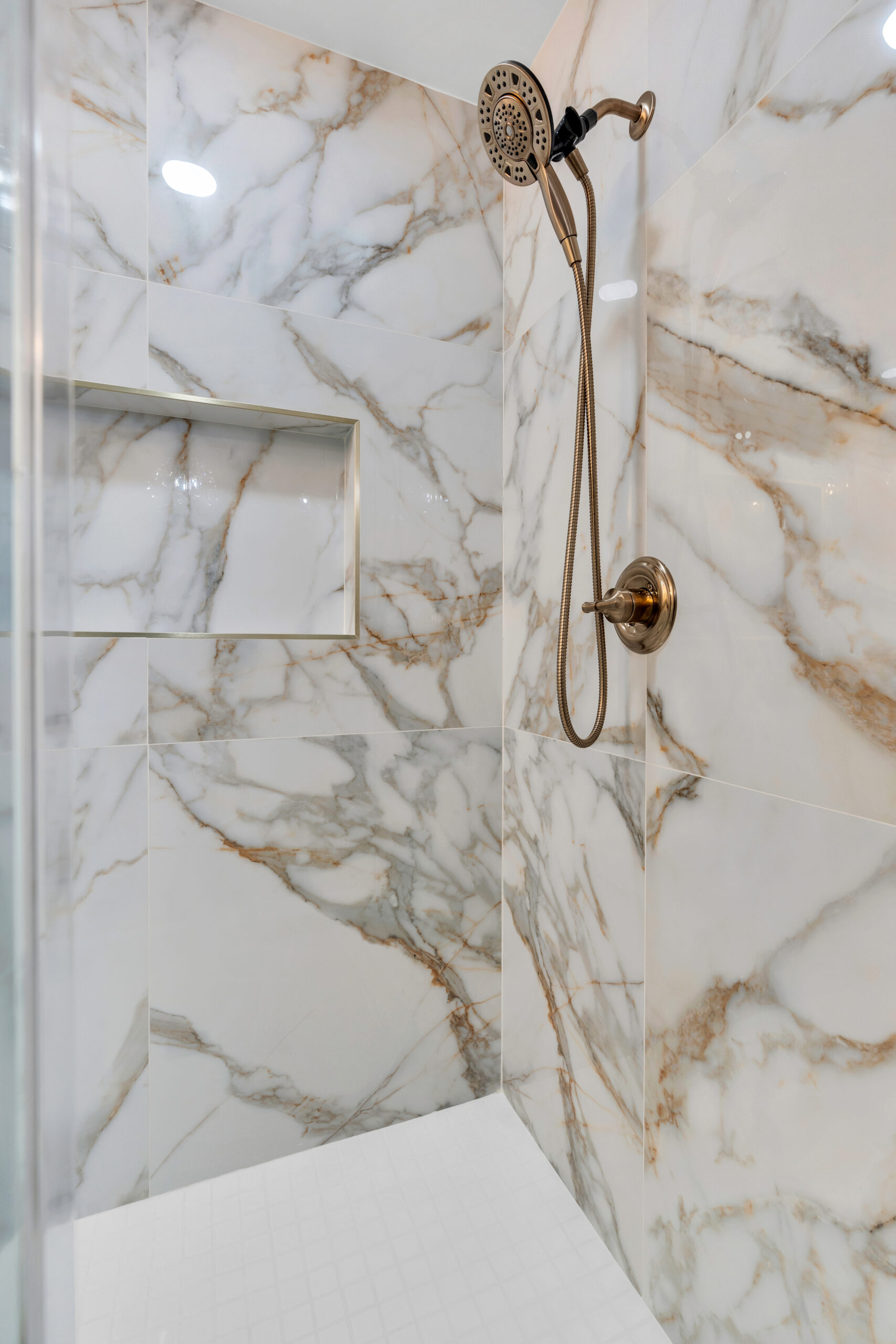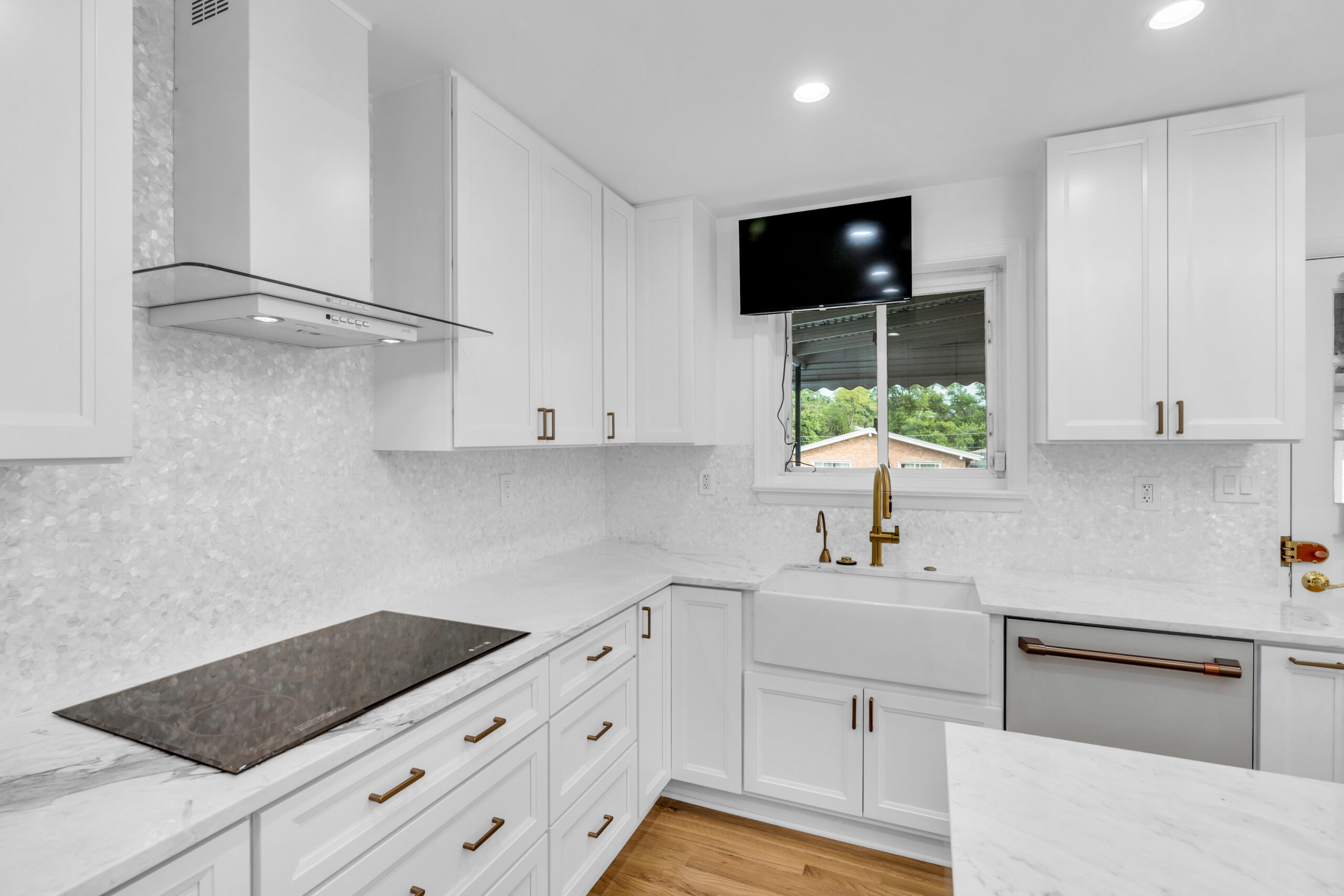 Luxury living took center stage in this stunning Hyattsville home remodeling project featuring kitchen and bathroom renovations. In the kitchen, sleek white shaker cabinets replaced dated oak, paired with elegant gold hardware and expansive white countertops. A crystal chandelier adds unexpected glamour overhead while warm hardwood floors ground the space beautifully. Down the hall, the bathroom mirrors this sophisticated aesthetic with large-format marble, a freestanding soaking tub, and a custom vanity. Gold fixtures and crystal lighting carry the cohesive design throughout. From cooking to relaxing, every space now balances elegant style with everyday function.