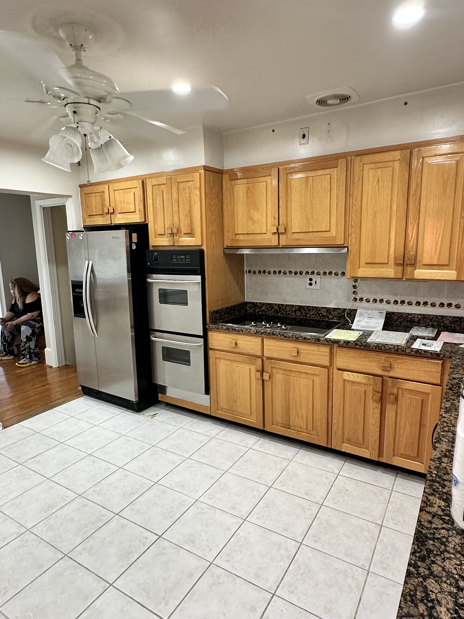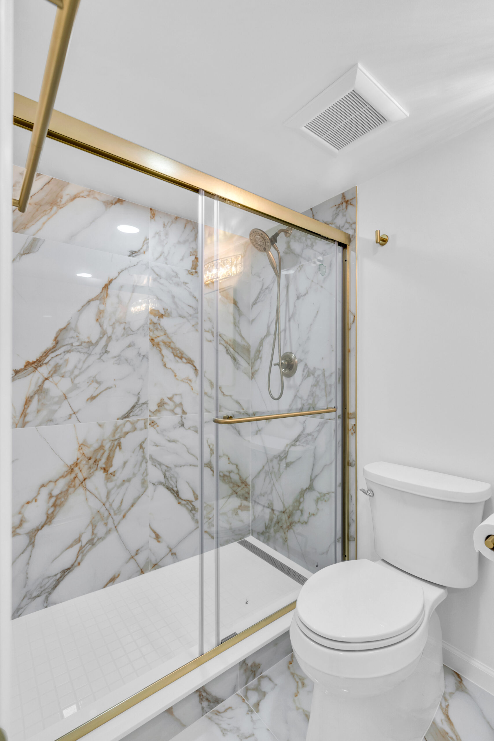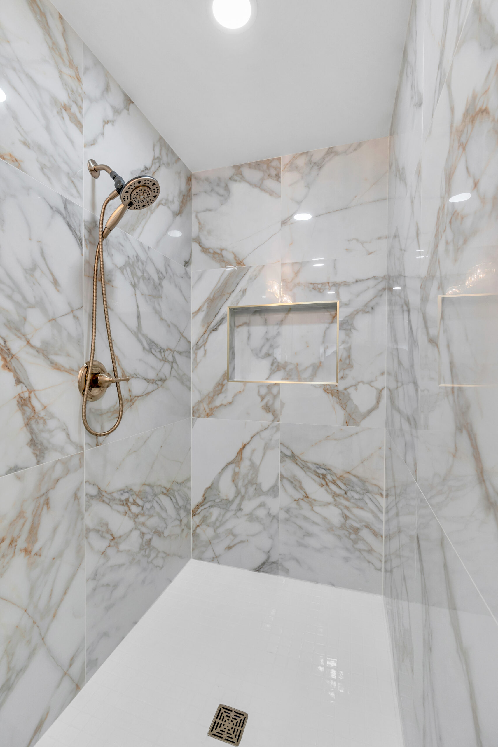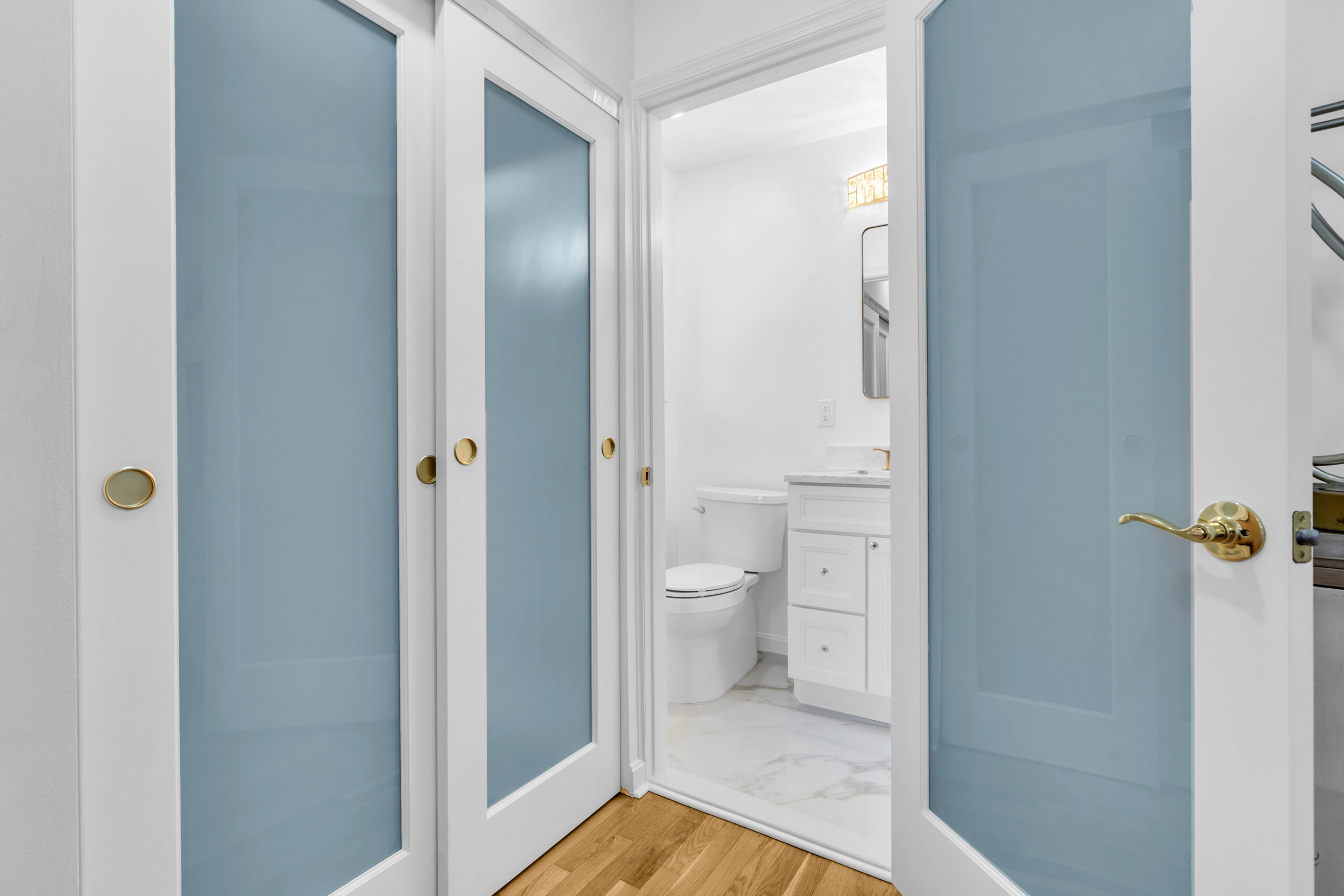 Luxury living took center stage in this stunning Hyattsville home remodeling project featuring kitchen and bathroom renovations. In the kitchen, sleek white shaker cabinets replaced dated oak, paired with elegant gold hardware and expansive white countertops. A crystal chandelier adds unexpected glamour overhead while warm hardwood floors ground the space beautifully. Down the hall, the bathroom mirrors this sophisticated aesthetic with large-format marble, a freestanding soaking tub, and a custom vanity. Gold fixtures and crystal lighting carry the cohesive design throughout. From cooking to relaxing, every space now balances elegant style with everyday function.